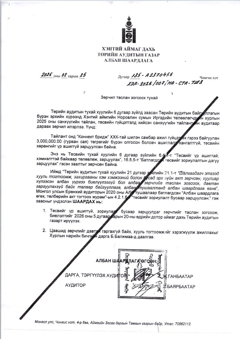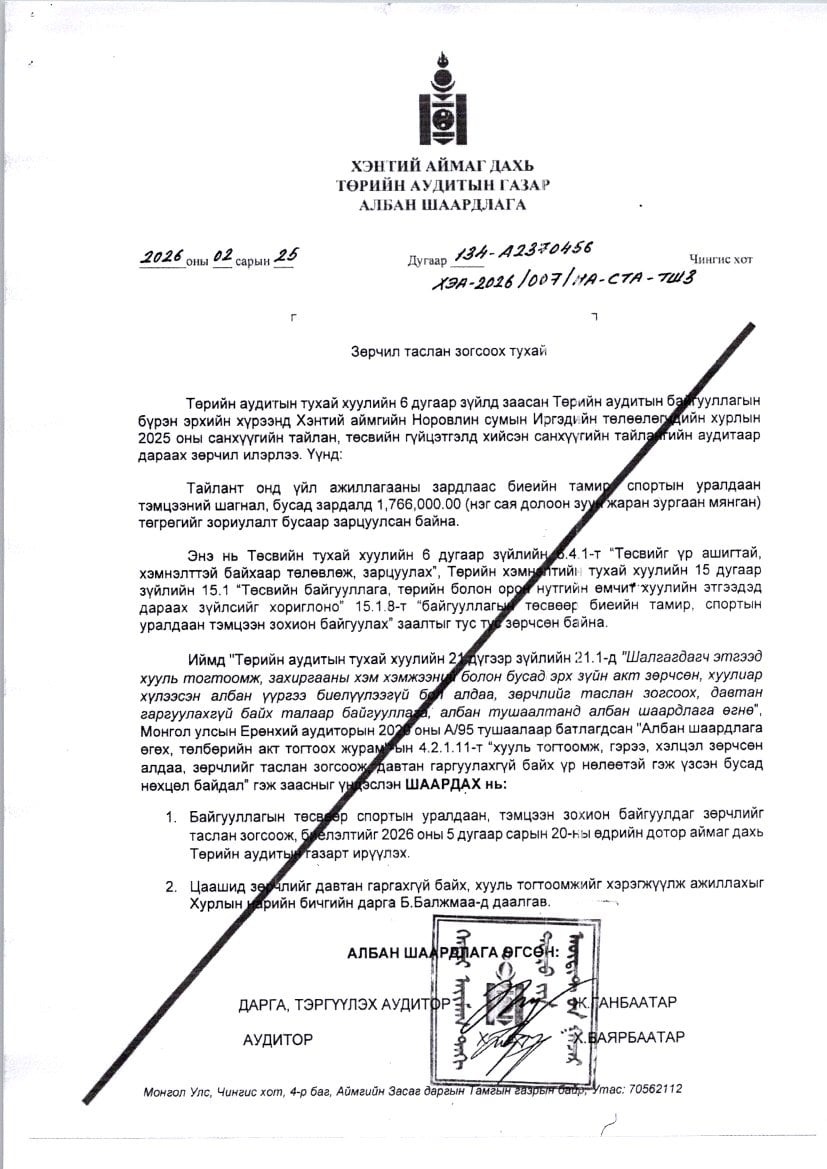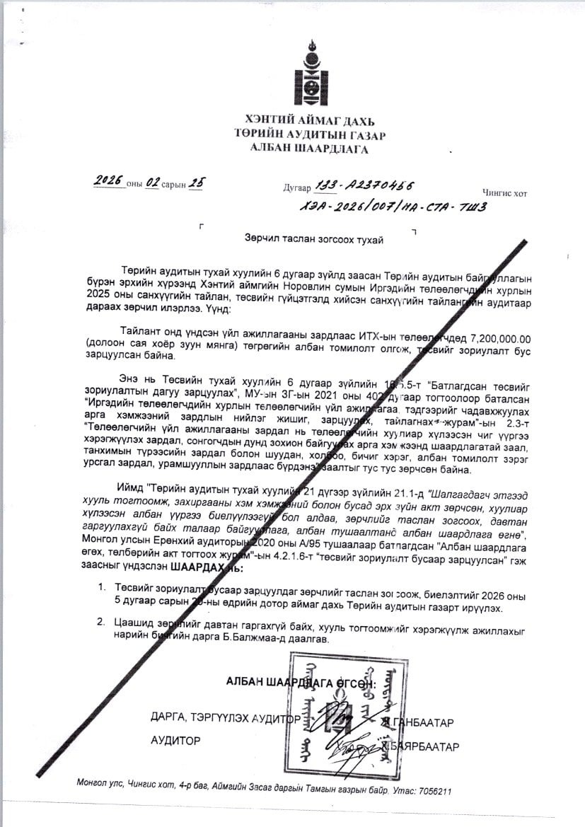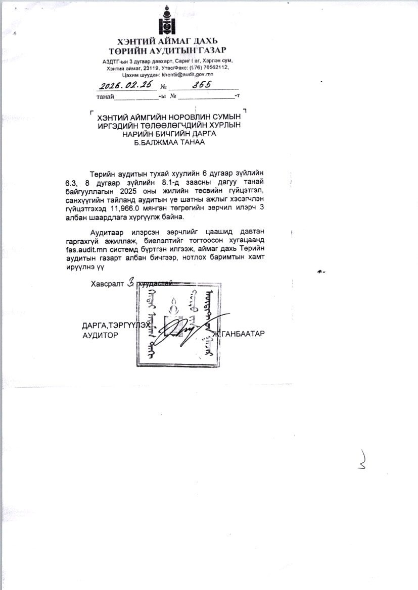 2025 оны санхүүгийн тайланд аудитаар 11,966.0 мянган төгрөгийн албан шаардлага өгсөн.